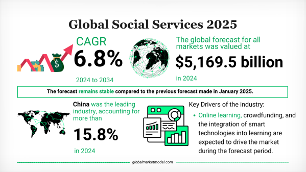 世界の社会サービス産業は二〇二四年に五兆一千六百九十五億ドル規模となり、世界国内総生産の四・三%を占めている。今後十年間で、同分野は年平均成長率六・八%で拡大すると見込まれており、これはアクセスしやすい教育、福祉提供の高度化、対応力の高いメンタルヘルス体制への需要増加を反映している。