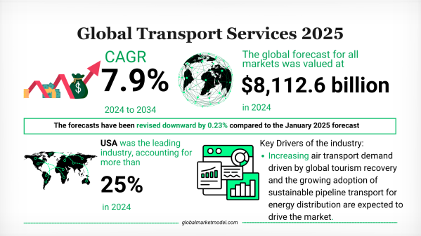 世界の運輸サービス産業は二〇二四年に八兆一千百二十六億ドル規模となり、世界国内総生産の六・七%を占めている。今後十年間で、本分野は年平均成長率七・九%で拡大すると見込まれており、旅客移動の回復、大規模な物流インフラ投資、技術を活用したサービスの急速な進化がその成長を牽引している。