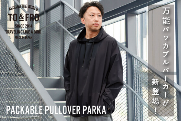 ファクトリーブランドとして生地から生産するTO&FROは、インナーにもアウターにも使え、急な雨にも対応できる万能な「パッカブルプルオーバーパーカー」を発売いたします。軽さと機能性にこだわりをもつTO&FROらしく、その重さはM-Lサイズで287gとりんご1個分程度。高機能なリサイクルナイロンを使用したサステナブルなアイテムで、普段使いもしていただきやすいよう、シンプルながらベストなパターンを追求した1着に仕上がりました。