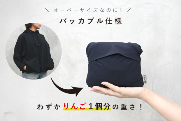 「パッカブルプルオーバーパーカー」は、1枚で普段使いのパーカーとしてはもちろん、アウターとして上から被ったり、コートの中に重ねてインナーとして使うなど、年間を通して様々なシーンでご着用いただけます。シルエットは、オーバーサイズに設定することで、着ている服の上からも重ねて着やすく、体型をカバーしながら、体も冷やしにくい絶妙な丈感を採用しました。撥水性に優れ、ストレッチの効いた生地を採用しているため、急な雨のシーンにも対応できる安心感があり、ストレスフリーな着心地も魅力です。