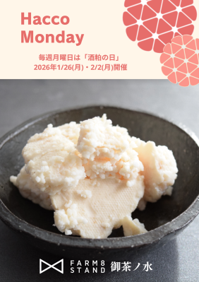 2月8日(日)に営業終了を迎える「FARM8 STAND」最後の『Hacco Monday』として、より多くの方に酒粕を日常に取り入れていただきたいという思いから、感謝を込めた50円の大奉仕価格で実施します。