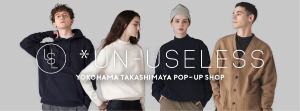 UN-USELESSは、ニット(横編み)の製法をベースにベーシックなファッションアイテムを展開するブランドです。一見すると一般的なスウェットやTシャツに見えますが、ニットならではの袖を通したときの柔らかさや、セーターの様な風合いなど、カットソーとは異なる感覚があります。そうした違いは、写真や言葉だけでは伝えきれません。実際に触れ、着ることで初めて感じていただけます。だからこそUN-USELESSは、これまでも大切にしてきた「実際に触れ、着て体感する場」として、横浜高島屋にて POP-UP SHOPを開催します。