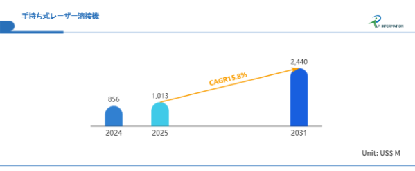LP Information調査チームの最新レポートである「世界手持ち式レーザー溶接機市場の成長予測2025~2031」(https://www.lpinformation.jp/reports/205607/handheld-laser-welder)によると、2025年から2031年の予測期間中のCAGRが15.8%で、2031年までにグローバル手持ち式レーザー溶接機市場規模は24.4億米ドルに達すると予測されている。