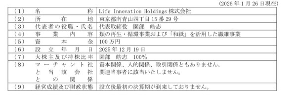 Life Innovation 社は、国内の大手アパレル会社のファッションデザイナーとしての経歴を持つ園部皓志氏が、クレサヴァ株式会社(本社:東京都港区南青山三丁目4 番7 号401 号室、以下、「クレサヴァ社」といいます。)で積み上げてきた、廃棄衣類のリサイクル事業および「和紙」を活用した繊維事業について、クレサヴァ社との協力関係のもと、マーチャント社との共同事業により、さらに進化するため、設立した会社です。