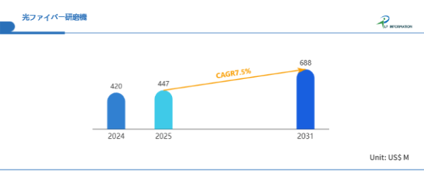 LP Informationのレポート「世界光ファイバー研磨機市場の成長予測2025~2031」(https://www.lpinformation.jp/reports/523558/fiber-optic-polishing-machine)によれば、2025~2031年の予測期間中、年平均成長率は7.5%と堅調な成長が見込まれ、2031年には市場規模が6.88億米ドルに達する見込みである。このように、下流の光通信機器需要の増加が研磨機の上流市場に強く波及し、素材や部品の供給連鎖にも影響を与える点が重要である。