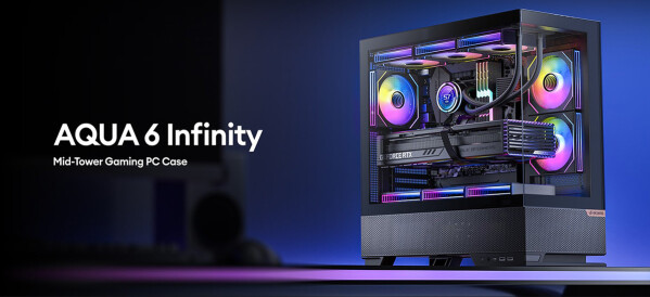 Aqua 6 Infinityは、優れたコストパフォーマンスを実現するエントリークラスのATX対応ピラーレスPCケースです。トップパネルは360mmラジエータの搭載に対応し、高性能CPUやGPUを採用した最新構成にも適合するだけでなく、Infinityミラー加工を施した付属のARGBファン3基により、システム全体のライティング効果を強化します。ケース下部は大面積のフルメッシュ構造を採用することで吸気効率を高め、ピラーレスケースでありながら強力なエアフローを実現しています。