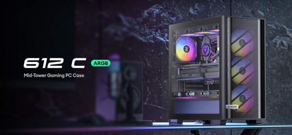 612 C ARGBは、Okinosが新たに提案する「NUMERIC」シリーズの第1弾です。実用性や品質に妥協することなく、優れたコストパフォーマンスを実現するコンセプトのもと、優れた拡張性に加えて4つのARGBファンを標準搭載し、冷却性能・拡張性・ライティング機能をバランスよく備えています。エントリークラスの価格帯でありながらゲーミングやクリエイティブといった性能重視の構成から、ライティングをふんだんに活用した見た目重視のシステムまで幅広く対応するATXケースです。