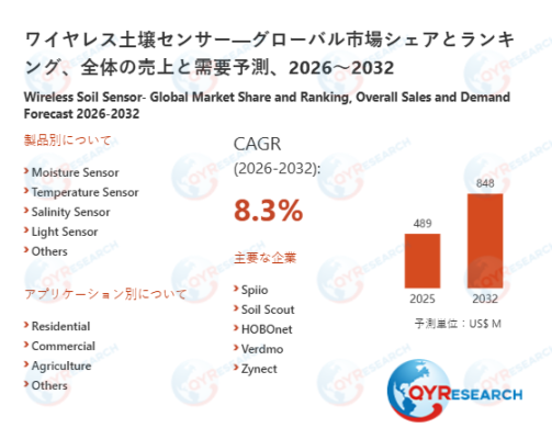 2025年におけるワイヤレス土壌センサーの世界市場規模は、489百万米ドルと予測され、2026年から2032年の予測期間において、年間平均成長率(CAGR)8.3%で成長し、2032年までに848百万米ドルに達すると予測されている。