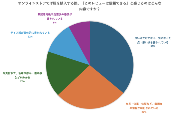 また、身長・体重・体型といった着用者情報や、写真付きで色味や生地感が分かるレビューも、信頼できるポイントとして挙げられていました。 実物を確認できないオンライン購入においては、こうした情報が商品のイメージを補い、購入判断を後押ししていると考えられます。