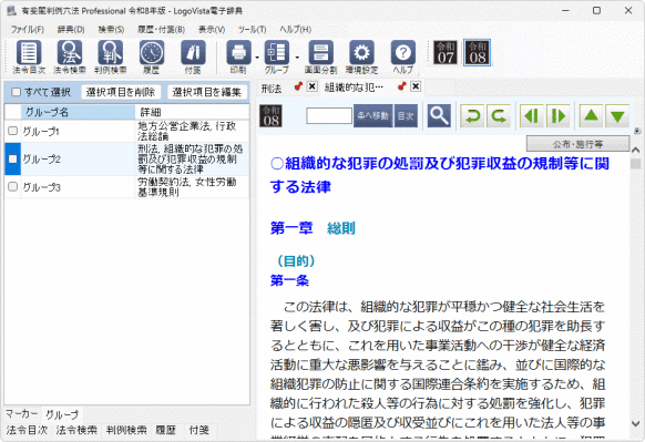 [グループ]一覧から閲覧したいグループ名を選択すれば、グループに含まれる法令をワンクリックで開けます。