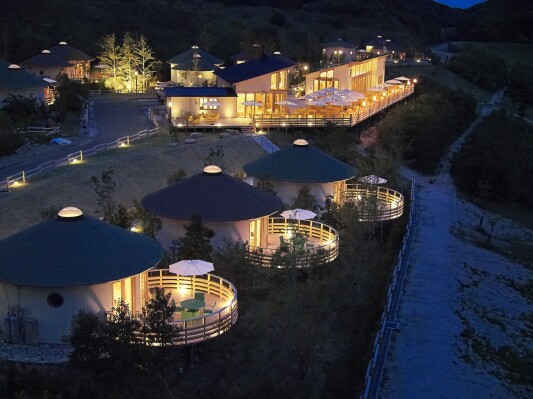 グランシャリオ北斗七星135°は、全23室の客室は繭(コクーン)を思わせる空間で、 高さ5メートル以上の天窓から眺める朝日や星空は、まさに絶景。食事は、国内外に13店舗のお店を持ち、日本代表マスターシェフである山下春幸氏が監修。「御食国」として朝廷に食材を納めてきた食の宝庫、淡路島の食材にこだわった料理を堪能できます。