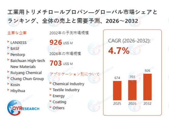 2025年における工業用トリメチロールプロパンの世界市場規模は、674百万米ドルと予測され、2026年から2032年の予測期間において、年間平均成長率(CAGR)4.7%で成長し、2032年までに926百万米ドルに達すると予測されている。