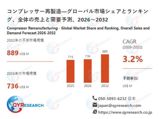 2032年には、コンプレッサー再製造の世界市場規模が889百万米ドルに達すると予測されており、今後数年間で着実な成長が見込まれています。2025年の市場規模は715百万米ドルと推定され、2026年には736百万米ドルに拡大すると予想されています。さらに、2026年から2032年にかけて、市場は年平均成長率(CAGR)3.2%で成長し、技術革新、需要の増加、業界の投資拡大がこの成長を支える主要な要因となると考えられています。