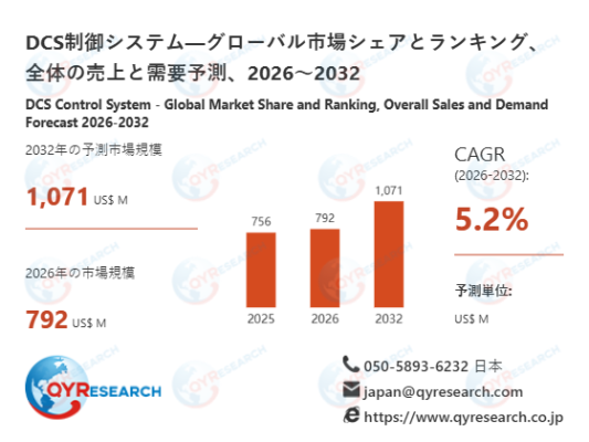 DCS制御システムの世界市場規模は2025年に756百万米ドルと推定され、2026年には792百万米ドルに達すると予測されています。さらに、2026年から2032年まで年平均成長率(CAGR)5.2%で成長すると予測されています。この成長により、2032年には市場規模が1071百万米ドルに達すると見込まれています。
