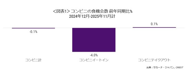 コンビニを利用した食事や間食の食機会数の前年同期比(図表1)は、2025年(2024年12月-2025年11月計)に0.1%減でした。利用形態別にみると、テイクアウトは0.1%増でしたが、イートインの食機会数が4.0%減で、コンビニ計の食機会数のマイナスへ引き下げました。
