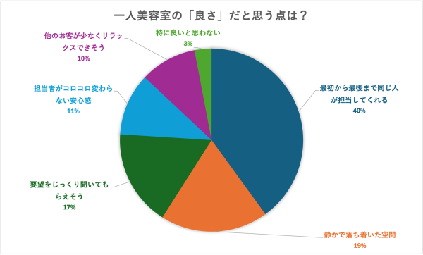 「最初から最後まで同じ人が担当してくれる」「静かで落ち着いた空間」「要望をじっくり聞いてもらえそう」といった回答が多く、一人美容室は丁寧さ・安心感・プライベート感を重視する人に強く支持されていることが分かります。