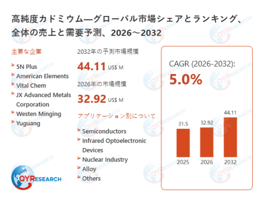 QY Research株式会社(東京都中央区)は、「高純度カドミウム―グローバル市場シェアとランキング、全体の売上と需要予測、2026~2032」の最新レポートを発表しました。