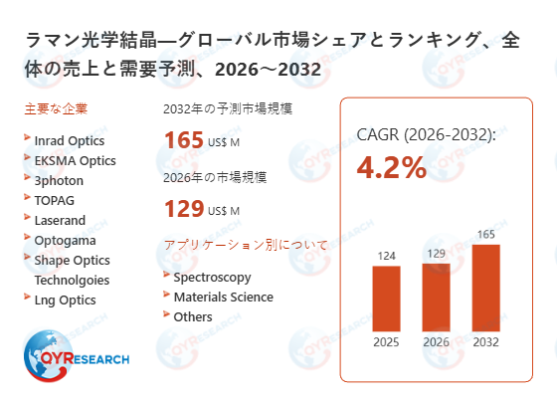 ラマン光学結晶の世界市場は、2025年に約124百万米ドルと推定されており、2026年には129百万米ドルに達する見通しです。今後は、2026年から2032年にかけて年平均成長率(CAGR)4.2%で成長し、2032年には約165百万米ドル規模に拡大すると予測されています。
