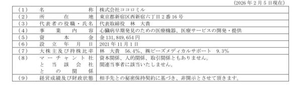 2026 年2 月中旬、第三者割当の方法により、マーチャント社がココロミル社の普通株式を1 株当たり2,599 円で19,500 株(総額50,680 千円、第三者割当増資後の発行済株式数1,647,479 株の1.2%)を取得いたします。