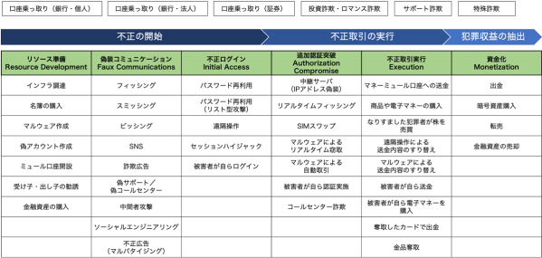 ラックは、この課題認識のもと、日本の金融犯罪の実情に即したナレッジベースの金融犯罪キルチェーンを「FC3 マトリクス」として整理しました。金融犯罪キルチェーンは、口座乗っ取りや不正送金、特殊詐欺、投資詐欺などの多様な犯罪者の攻撃手口をサイバーキルチェーンの考え方で整理し、犯罪の進行段階に沿って体系化している点が特長です。断片的になりがちな事例や対策を一本の線で捉え直すことで、いま何が起きているのか、どこに手を打つべきかを直感的に把握できます。また、金融犯罪キルチェーンによって金融機関や警察関係者が共通言語を持ち、迅速かつ実践的に情報共有・議論を進めるための土台として提供します。