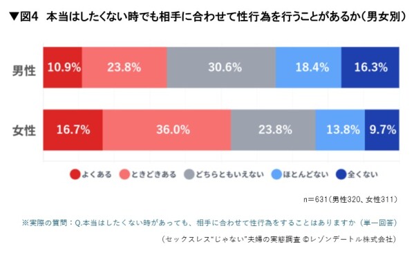 この結果から、セックスレス“じゃない”夫婦であっても、性行為が常に双方の気持ちが一致した状態で行われているとは限らないことが分かります。特に女性では、自身の気持ちとは必ずしも一致しないまま、相手に合わせて性行為を行う場面が相対的に多い可能性がうかがえます。