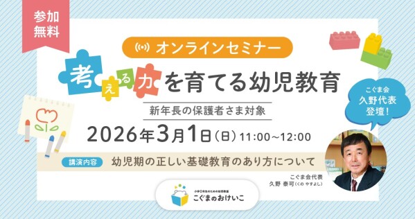 オンラインセミナー「『考える力』を育てる幼児教育」は、「こぐま会」久野代表が、幼児期の正しい基礎教育のあり方について講演。体験授業では、お子さまに実際の授業を体験していただくほか、久野代表による授業の解説もあります。体験授業は、もちろん保護者さまにもご見学いただけます。