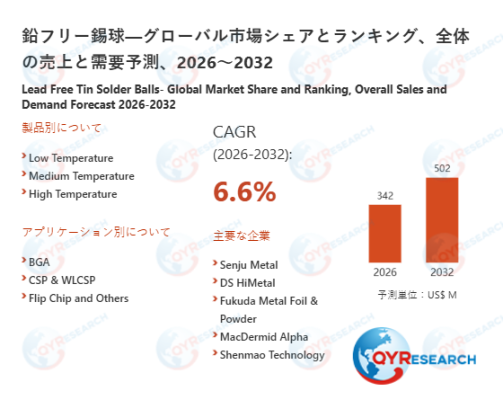 2025年における鉛フリー錫球の世界市場規模は、323百万米ドルと予測され、2026年から2032年の予測期間において、年間平均成長率(CAGR)6.6%で成長し、2032年までに502百万米ドルに達すると予測されている。