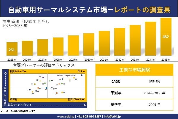 自動車用サーマルシステム市場に関する当社の調査レポートによると、自動車用サーマルシステム市場規模は 2035 年に約 482 億米ドルに達すると予想されています。さらに、2025 年の 自動車用サーマルシステム市場規模は約 251 億米ドルとなっています。自動車用サーマルシステムに関する市場調査レポートでは、市場は 2026-2035 年の予測期間中に約 6.8% の CAGR で成長するとも述べられています。