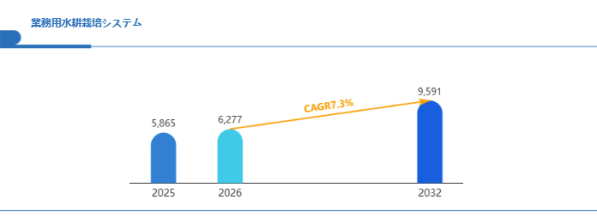 都市部での農地不足が深刻化する中、限られたスペースで高収量を実現できる業務用水耕栽培システムの価値が高まっています。ビル内や屋上などでも設置可能で、都市農業のソリューションとして市場を拡大しています。