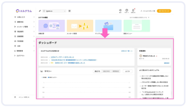 これまでは、エルグラムからの配信数や総フォロワー数の変動を個別の画面で確認する必要がありましたが、ダッシュボードの追加によりサマリーで確認できるようになりました。