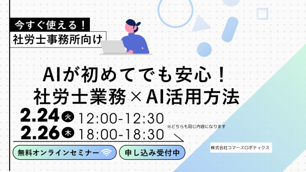 タイトル:AIが初めてでも安心!質問するだけで社労士業務を支援するセミナー| 2/24(火)、26(木)開催