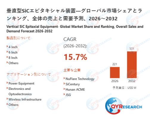2032年の世界垂直型SiCエピタキシャル装置市場は約531百万米ドルに達すると見込まれています。今後の成長軌道は年平均成長率(CAGR)15.7%で推移し、2026年には市場規模が221百万米ドル、2025年時点では約194百万米ドルと推計されています。