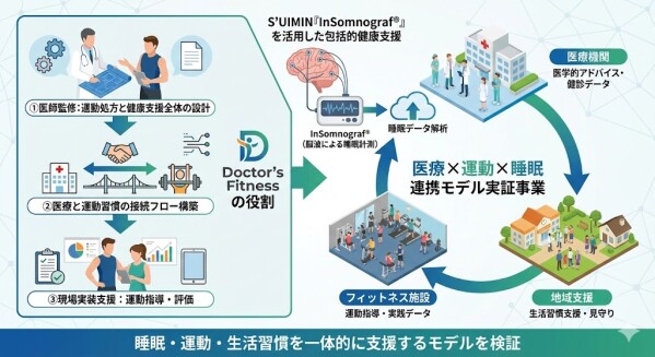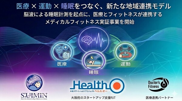 株式会社 Doctor’s Fitness(本社:大阪府大阪市、代表:宮脇 大)は、株式会社 S’UIMIN(本社:東京都、取締役 CSO 会長:柳沢 正史)および地域フィットネス施設と連携し、睡眠の脳波データを起点にした「メディカルフィットネス実証事業」に参画します。本実証は大阪府「大阪スマートヘルスプロジェクト Health-O」の支援を受け、医療・運動・睡眠が一体となった地域健康支援モデルの有効性検証を目的としています。