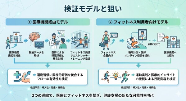 本実証事業では、S’UIMIN の脳波による睡眠計測サービス「InSomnograf(R)(インソムノグラフ)」を活用し、医療機関・フィットネス施設・地域支援との連携により、睡眠・運動・生活習慣を一体的に支援するモデルを検証します。