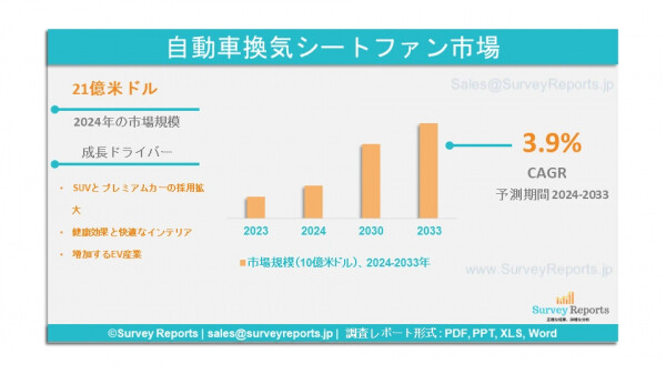 Surveyreportsの専門家は、自動換気シートファン市場の調査を分析し、2024年に自動換気シートファン市場規模が21億米ドルに達すると予測した。さらに、自動換気シートファン市場のシェアは、2033年末までに75億米ドルに達すると予測されている。自動換気シートファン市場は、2024年から2033年の予測期間にわたって、年間平均成長率(CAGR)約3.9%で成長すると予測されている。