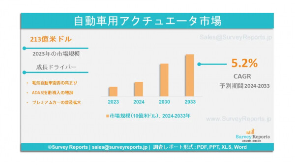 Surveyreportsの専門家は、自動車用アクチュエータ市場の調査を分析し、2023年の自動車用アクチュエータ市場規模は213億米ドルに達すると予測した。さらに、自動車用アクチュエータ市場のシェアは、2033年末までに334億米ドルに達すると予測されている。自動車用アクチュエータ市場は、2024年から2033年の予測期間にわたって、年平均成長率(CAGR)約5.2%で成長すると予測されている。