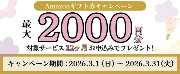 →上記サービスを契約期間12ヶ月間でご契約いただくと、Amazonギフト券2,000円分をプレゼント!