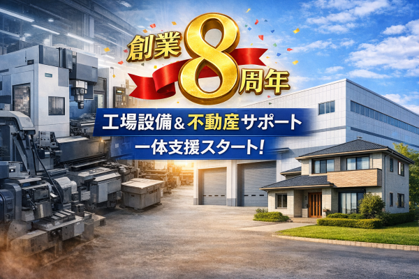 「創業8周年を迎えるにあたり、製造業企業様から寄せられるご相談は、機械単体の売却から工場全体の資産整理へと広がっています。今回の取り組みにより、設備と不動産を一体で相談できる体制を整えました。今後も透明性の高い機械買取サービスを提供してまいります。」