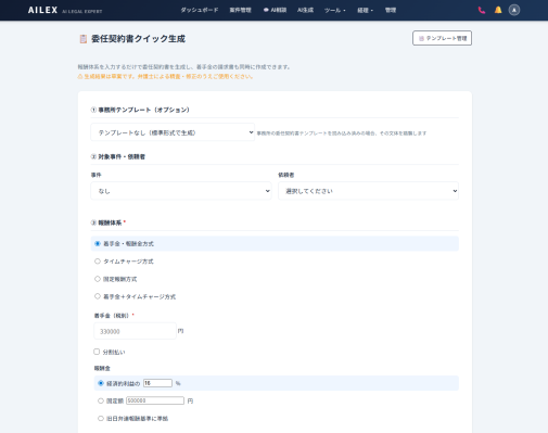 ※AIが生成する委任契約書は草案であり、弁護士による精査・修正が必要です。本機能は弁護士の業務を支援するツールであり、AIが法的助言を行うものではありません。