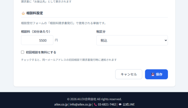 事務所設定画面に「相談料設定」セクションを新設しました。30分あたりの単価(デフォルト: 5,500円)、税込・税別の区分、初回相談無料の有無を設定できます。