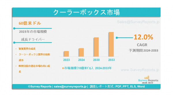 Surveyreportsの専門家は、クーラーボックス市場調査を分析し、2023年に生成されたクーラーボックス市場規模は60億米ドルであることを発見しました。また、クーラーボックス市場のシェアは、2033年末までに130億米ドルに触れる収益を予見するために。クーラーボックス市場は、2024年と2033年の予測期間中に約12%のCAGRで成長することが提案されています。