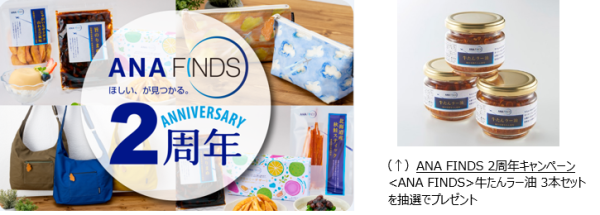 2026年2月20日(金)~3月31日(火)の期間中、A-styleにて『ANA FINDS』商品を合計18,000円(税込)以上ご購入いただくと、抽選で20名様に<ANA FINDS>牛たんラー油3本セット3,564円(税込)をプレゼントします。