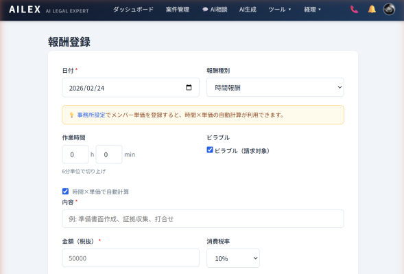 所属弁護士・パラリーガル・スタッフごとに時間単価(円/h)を設定し、作業時間の入力だけで報酬額を自動計算する機能です。最小記録単位は事務所ごとに6分・15分・30分・1時間から選択でき、入力された作業時間は設定単位に自動で切り上げられます。報酬登録画面では「2.50h × ¥35,000 = ¥87,500」のようにリアルタイムで計算結果がプレビュー表示されるため、入力ミスの防止にも寄与します。
