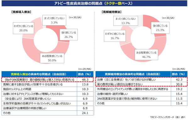 さらに、寛解導入・維持治療について、一定以上の課題意識を有しているドクターが多く、寛解導入治療では『費用により最適治療が選択できない』、寛解維持では『費用負担も考慮した治療継続期間の判断の難しさ』が中心的なアンメットニーズとなっている。