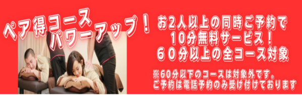 お2人以上の同時ご予約で60分以上の全コースで10分無料サービスとなります。