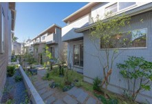 地役権を設定したフットパスを設けることで、行き来の自由度が増し、街区全 体とつながる「縁(エン)」を生んでいます。遊歩道のような楽しさを演出し、植栽、インターロッキング、飛び石を配置。住民同士の会話が弾むベンチや、夜間 に足元を優しく照らすライトも設置しました。 また、風の通り道と住戸に光を取り込む設計により、開放感ある空間を実現。 フットパスに面した住宅の窓は、室内にいながら植栽の緑が楽しめるよう高さを 工夫しています。
