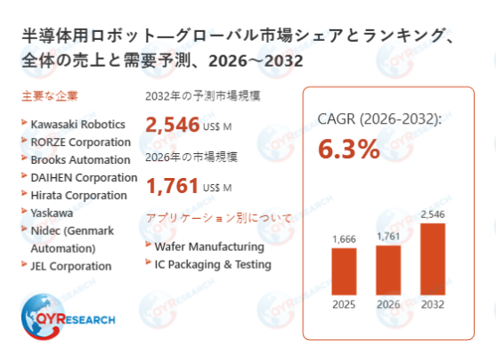 本調査では、2032年に世界の半導体用ロボット市場が約2546百万米ドルに達すると予測しています。この成長は、2026年から2032年にかけて年平均成長率(CAGR)6.3%で進むと見込まれており、2025年の市場規模は約1666百万米ドル、2026年には1761百万米ドルに達する見通しです。