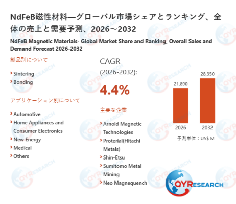 NdFeB磁性材料の世界市場規模は、2026年に21890百万米ドルと推定され、2032年までに28350百万米ドルに達すると予測されています。