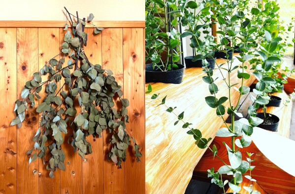 ななのゆサウナの日には、玄関からウッドデッキ、脱衣室、そしてサウナ室まで七山産ユーカリを飾り香りを楽しんでいただきます。