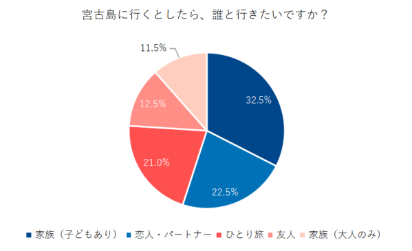 「家族(子どもあり)」32.5%、「恋人・パートナー」22.5%、「ひとり旅」21.0%、「友人」12.5%、「家族(大人のみ)」11.5%という結果でした。